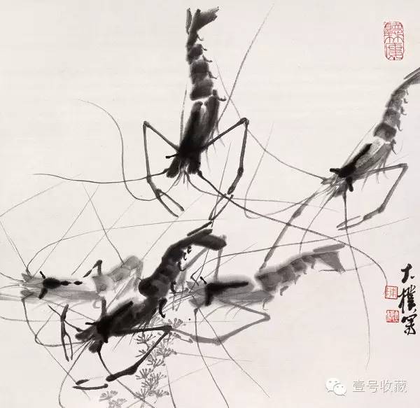 齐白石的虾可谓是画坛一绝,灵动活泼、栩栩如生、神韵充盈。他常用淡墨掷笔绘成躯体,浸润之色更显虾体晶莹剔透之感;以浓墨竖点为睛、横写为脑,落墨成金,笔笔传神;细笔写须、爪、大螯,刚柔并济、凝练传神,显示了画家高妙的书法功力。画家画虾来自生活,却超越生活,大胆概括简化,更得传神妙笔。